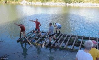 Es läuft bis jetzt alles nach Plan, das alte Floß wurde heute ab 16h vom Entsorgungsteam teilweise zerlegt und ca. um 17h vom Haken genommen. Ein Teil des Arbeitsteams paddelte und stangelte das Floß 20m stromauf, wo es bis zur endgültigen Entsorgung am Ufer vertäut wurde. Fast gleichzeitig ist der LKW mit dem neuen Floss eingetroffen, der Aufbau und die Wasserung des neuen Floßes ist für morgen Vormittag geplant.