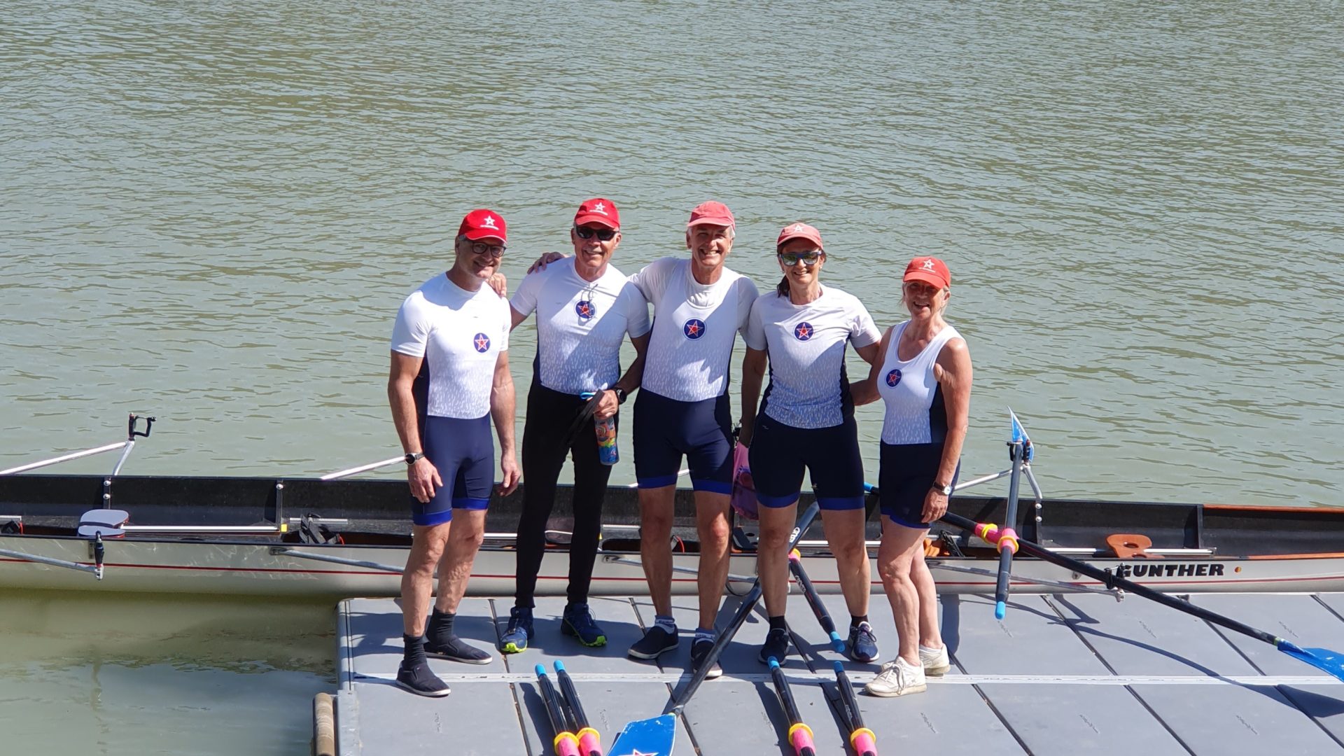 Leider sind wir in unserer Altersklasse die einzigen Starter. Die Aussage eines alten Masters, dass anständige Ruderer nicht starten, wenn sie keine Gegner haben, lässt unsere Stimmung und Motivation nicht sinken. Unser Ziel ist eine bessere Zeit als 2022, damals in der exakt gleichen Besetzung.