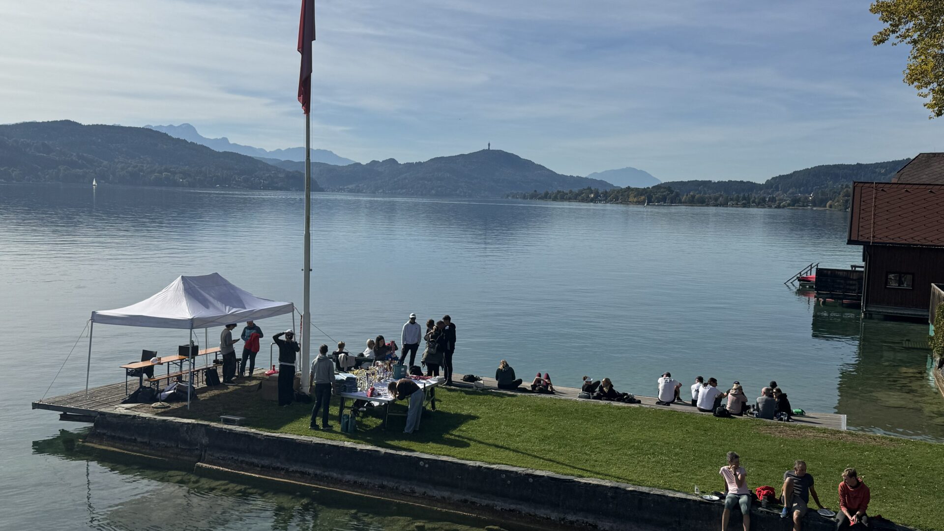 Kärnten und der Wörther See lieferten wieder eine der schönsten Szenarien für eine Regatta. Das Wasser tief blau mit Nuancen ins Petrol, verstärkt werden die Farben noch durch Sonneneinstrahlung. Die Wälder der begleitenden Hänge frühherbstlich gefärbt. Das Wassertemperatur frische 17°.